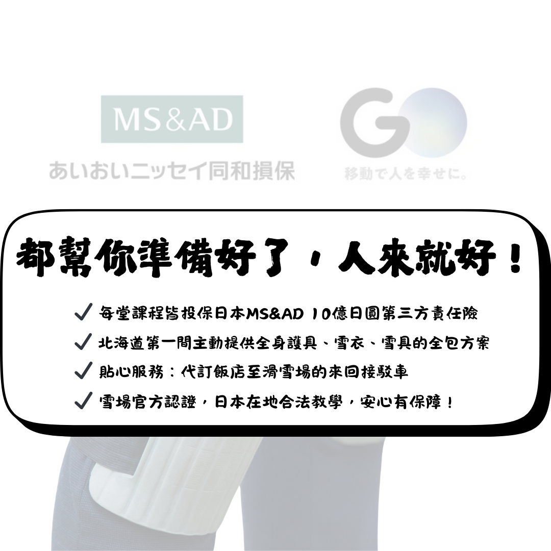 滑雪課程、雪場門票、雪衣雪具、雪場接駁,此方案全包了,專車直接至下塌飯店接駁至滑雪場,此外,我們是北海道少數有提供護具的滑雪學校。安全與省事,一次全都幫你想好了!